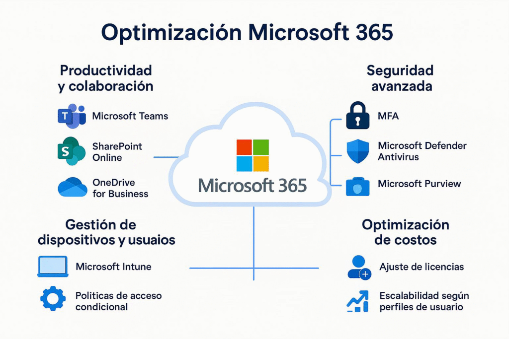 - Implementación de SharePoint Online para gestión documental y flujos de trabajo.